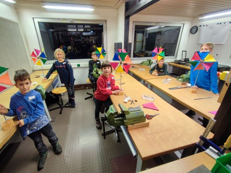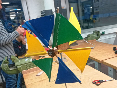 Dabei war wiederum die Geschicklichkeit der Teilnehmer gefordert. Mit Aufzeichnen der Teile auf dem Stoff, mit Ausschneiden, Nähen der Fähnchen an der Nähmaschine, Sägen der Stäbe in Handarbeit, Bohren des Rotors und der Stäbe an der Bohrmaschine, Verleimen der Stäbe, Montage des Rotors am Grundkörper, Befestigung der Drahthal-terung an den Stäben und den Fähnchen und die Montage der Halterung.