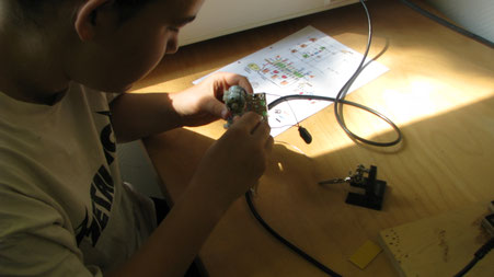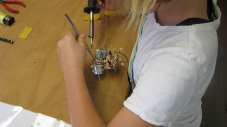 Neben dem Bau von unserm Mausefallenfahrzeug, der hauptsächlich Holzbearbeitung erfordert, haben wir dann die Schüler auch mit dem Löten vertraut gemacht und nach diversen Lötprobearbeiten und einer ersten Schaltung (Astabiler Multivibrator) mit dem Bau unseres Laufroboters weitere Erfahrung gesammelt.