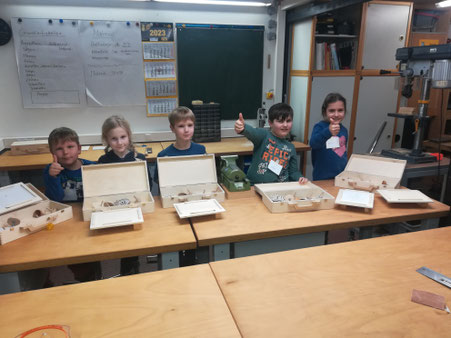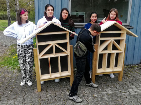 Vorgabe war an zwei Tagen mit zwei Gruppen vier Bienenhotels für Wildbienen und Insekten zu bauen. Diese sollen dann später aufgestellt werden.