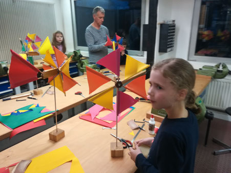 Gerade rechtzeitig zum Abholen wurden alle Windräder fertig und dann noch durch Blasen getestet, da es draußen regnete und kein Wind in Sicht war. Alles in allem wiederum ein gelungenes Projekt. Jetzt warten die Windräder nur noch auf reichlich herbstlichen Wind auf der Terrasse oder im Garten.